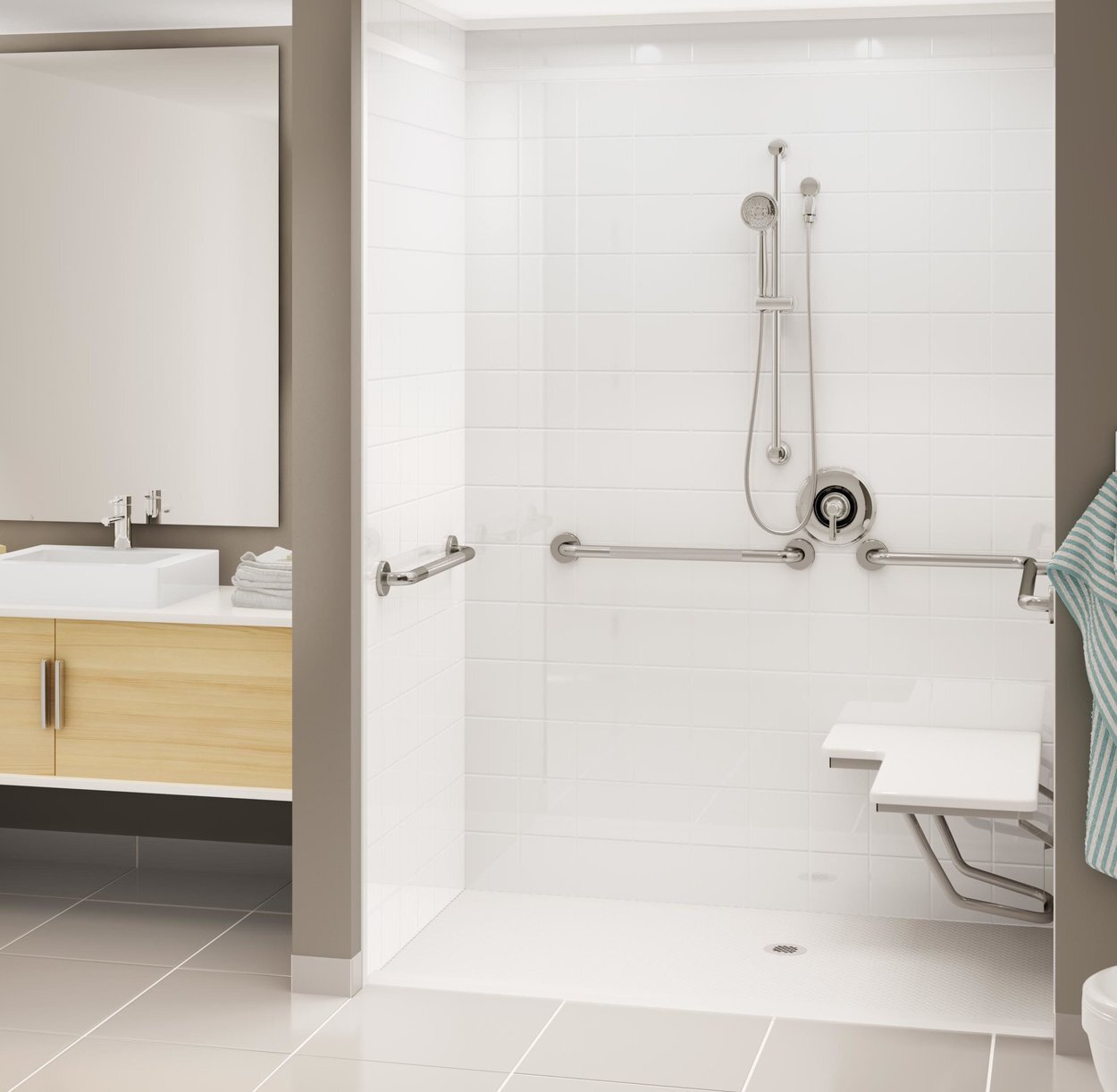 - Lever-style controls and handheld showerheads are easier to operate with reduced grip strength.